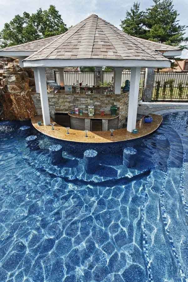 Build a bar counter along the pool’s edge, facing the water. Add submerged bar stools made of concrete or waterproof materials. These stools should be stable and smooth to sit on.