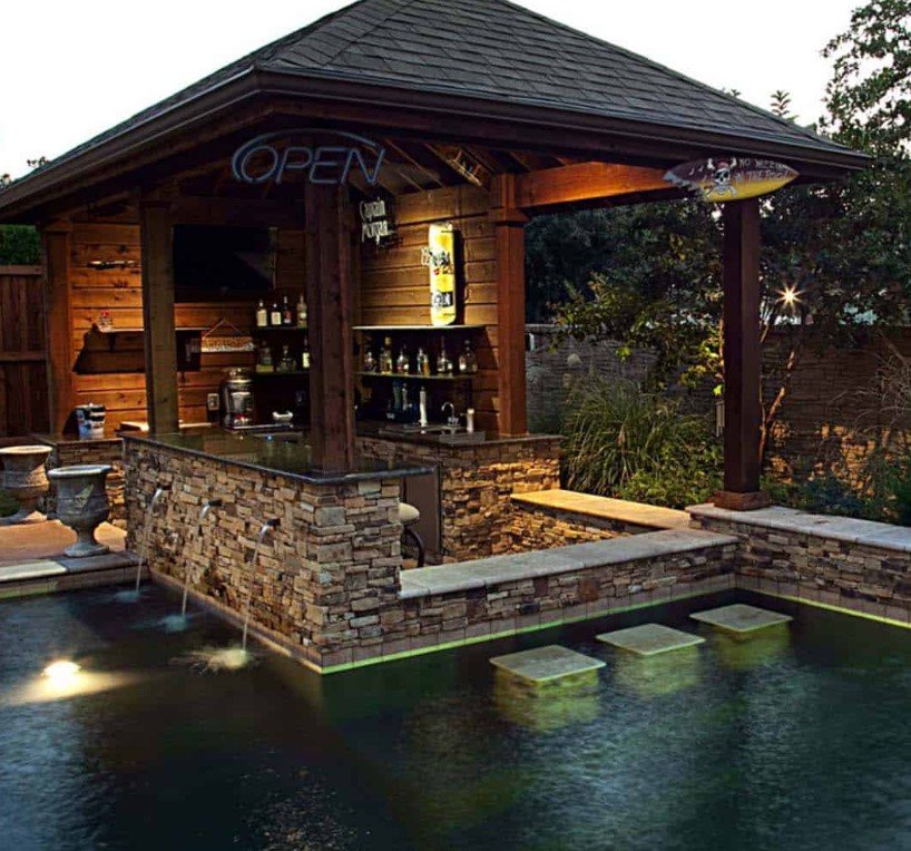 Use natural stone or wood for the bar counter. Add comfortable stools with cushions that match your outdoor decor. A shaded bar lets guests enjoy drinks and food without the harsh heat of the sun.