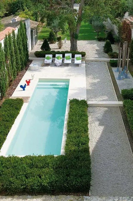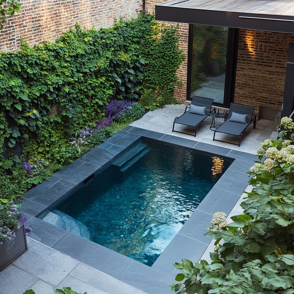 A compact rectangular pool can feel like a miniature resort, especially when paired with lounge chairs and subtle lighting.