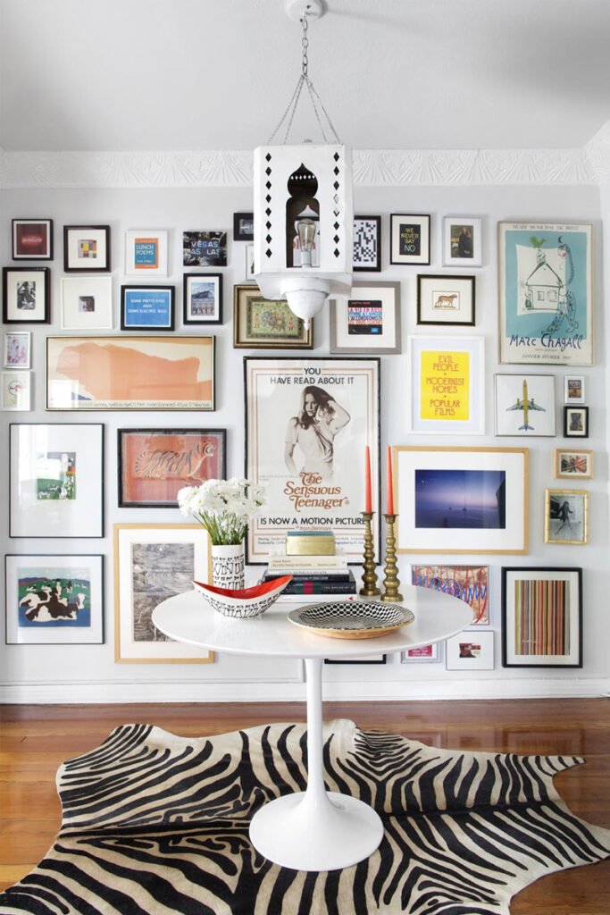 A gallery wall above the sofa or bed makes a strong focal point. Use lightweight frames so they are easy to hang.