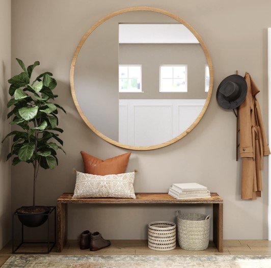A floor-length mirror near a window reflects natural light and spreads it across the room. Mirrors also act as stylish decor pieces and make the space look lively.