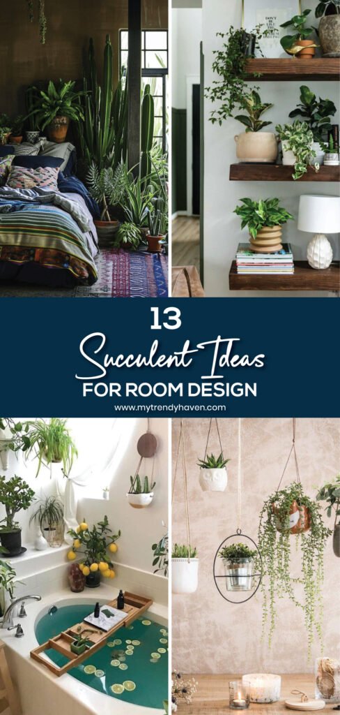 Succulents fit well in bedrooms, living rooms, kitchens, or even bathrooms. They work in both small apartments and large homes. From wall art to tiny table plants, there are many ways to design with them. Below are 13 detailed ideas to use succulents in your room design.