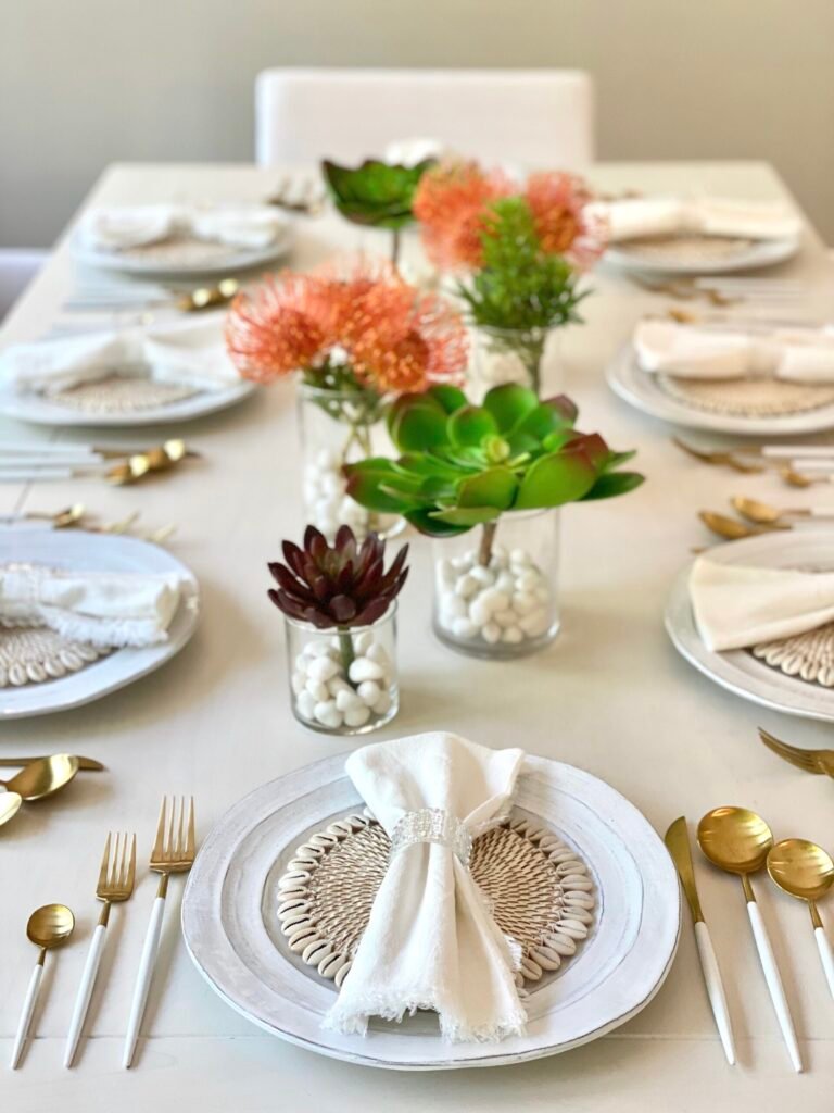 Care tip: Place the centerpiece where it gets daylight. Move it aside during meals if needed. Water sparingly, only when the soil feels dry.