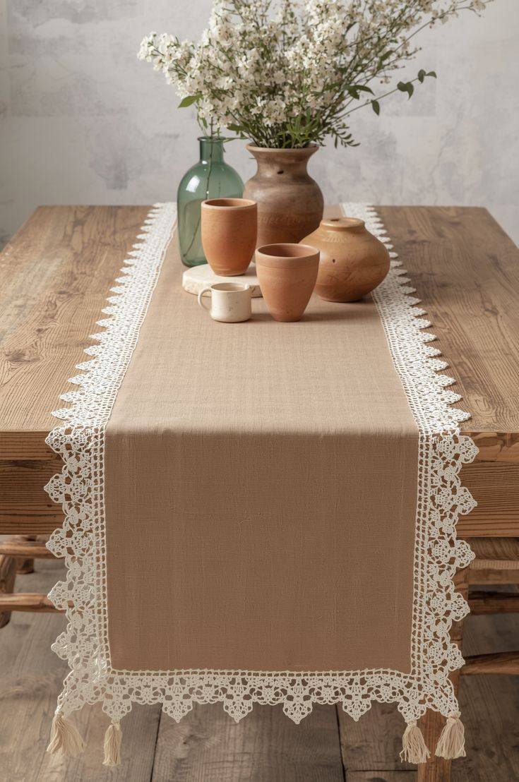 The contrast between the rough weave and the soft lace edging creates a calm, detailed style that suits everyday meals and relaxed get-togethers with ease.