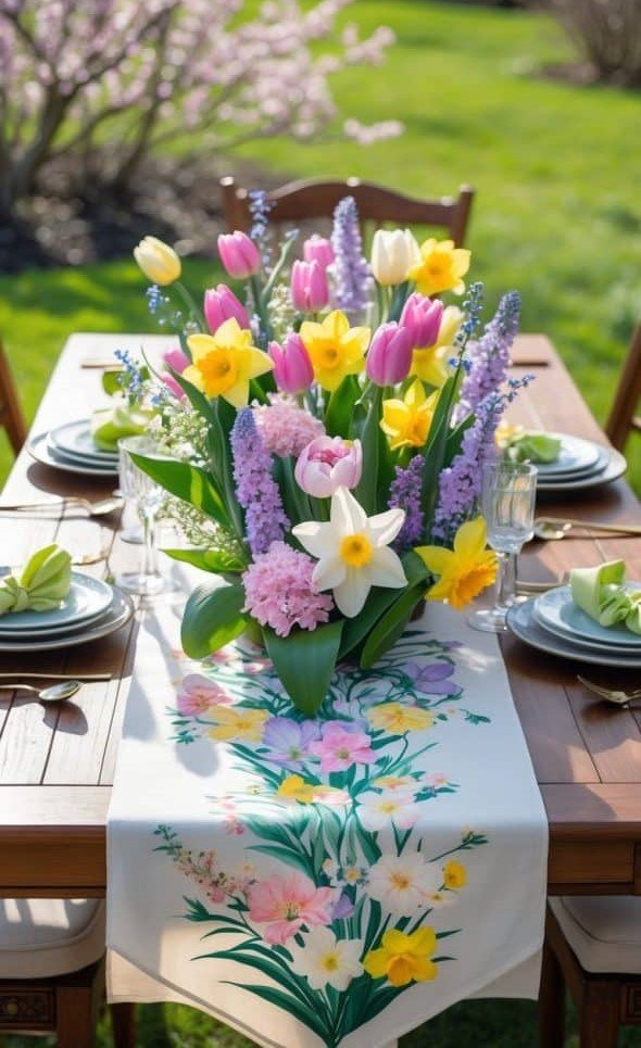 Soft pink, yellow, and lavender blossoms brighten this spring runner, echoing tulips, daffodils, and hyacinths arranged above it.