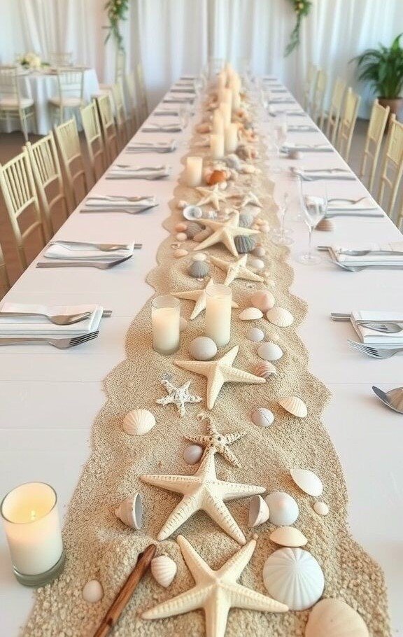 This beach-inspired runner is trimmed with starfish, shells, and soft pearl-like accents, forming a breezy centerpiece with gentle texture and charm.