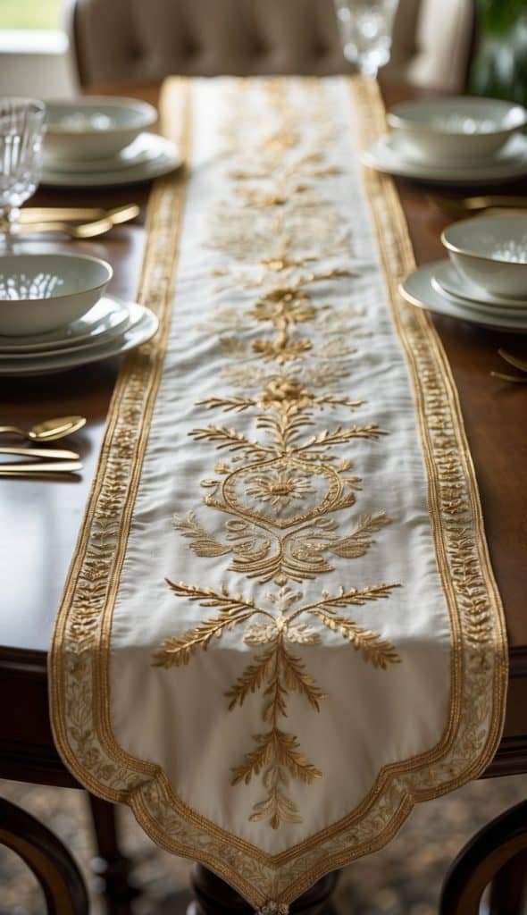 Intricate gold embroidery gives this runner a refined, luxurious character that elevates the entire table with subtle shimmer.