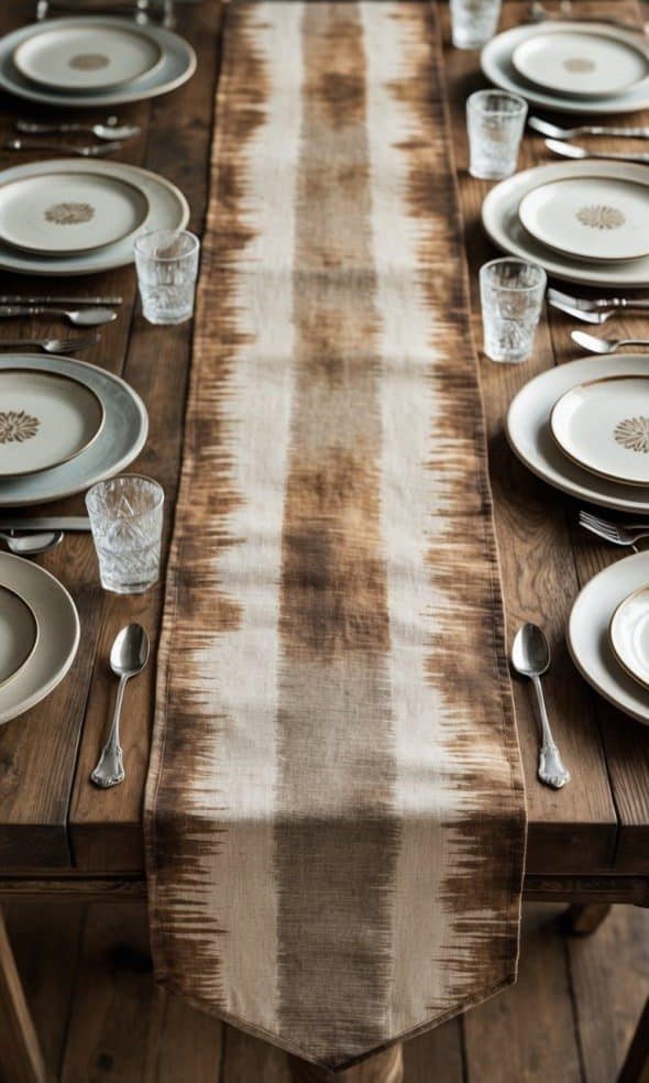 Earthy browns and soft gradients give this tie-dye runner an organic, rustic feel that blends smoothly into relaxed dining spaces.