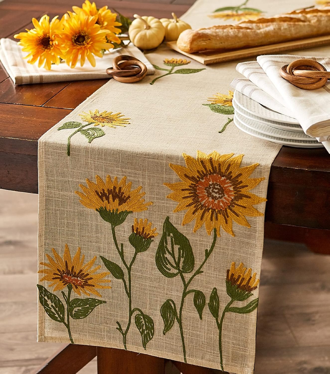 A burlap runner brushed with cheerful sunflower art brings a joyful rustic mood that suits late summer or fall with ease.
