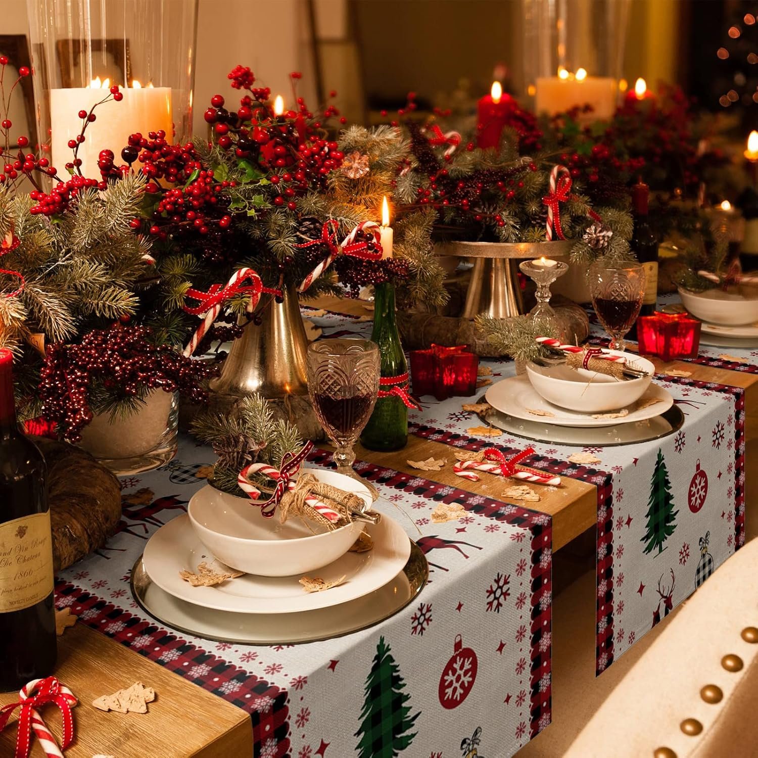 This layered holiday setup uses runners decorated with trees, reindeer, bows, and snowflakes in classic shades of red, green, and white.