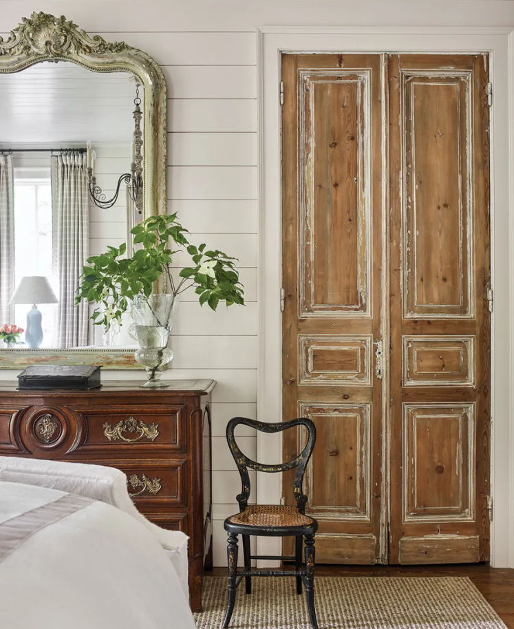 Give doors a worn-in finish with faded paint, sanded edges, and layered tones for built-in charm.