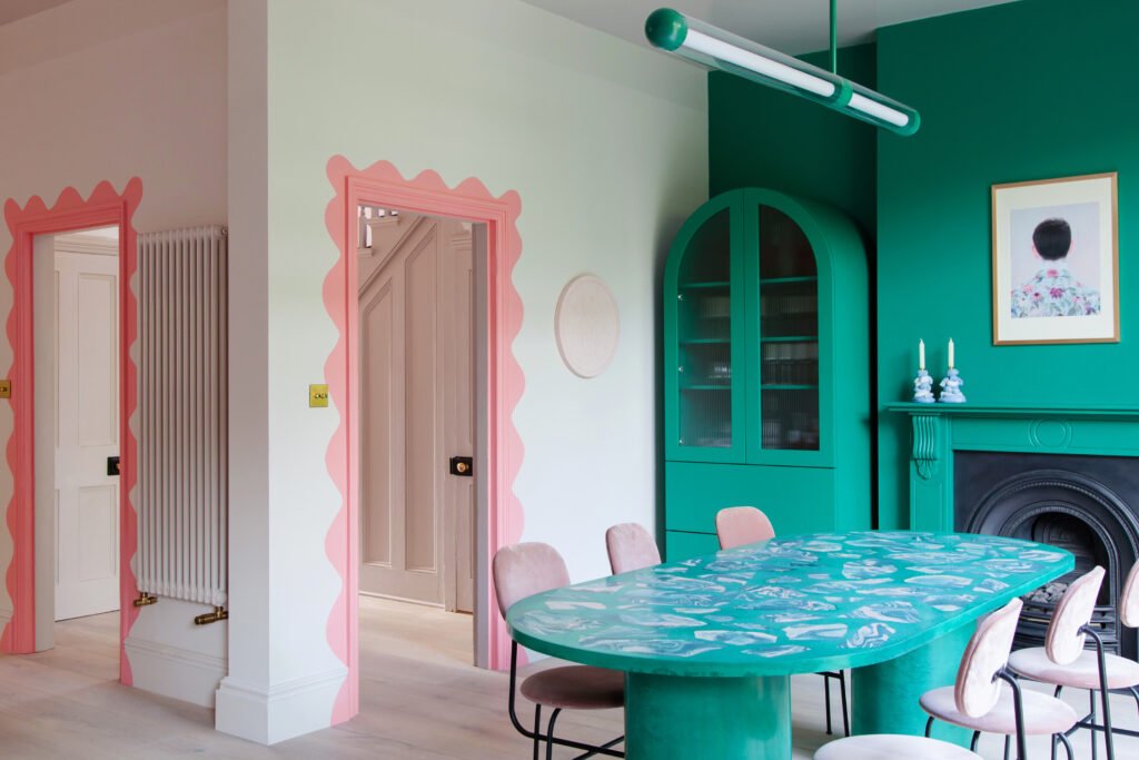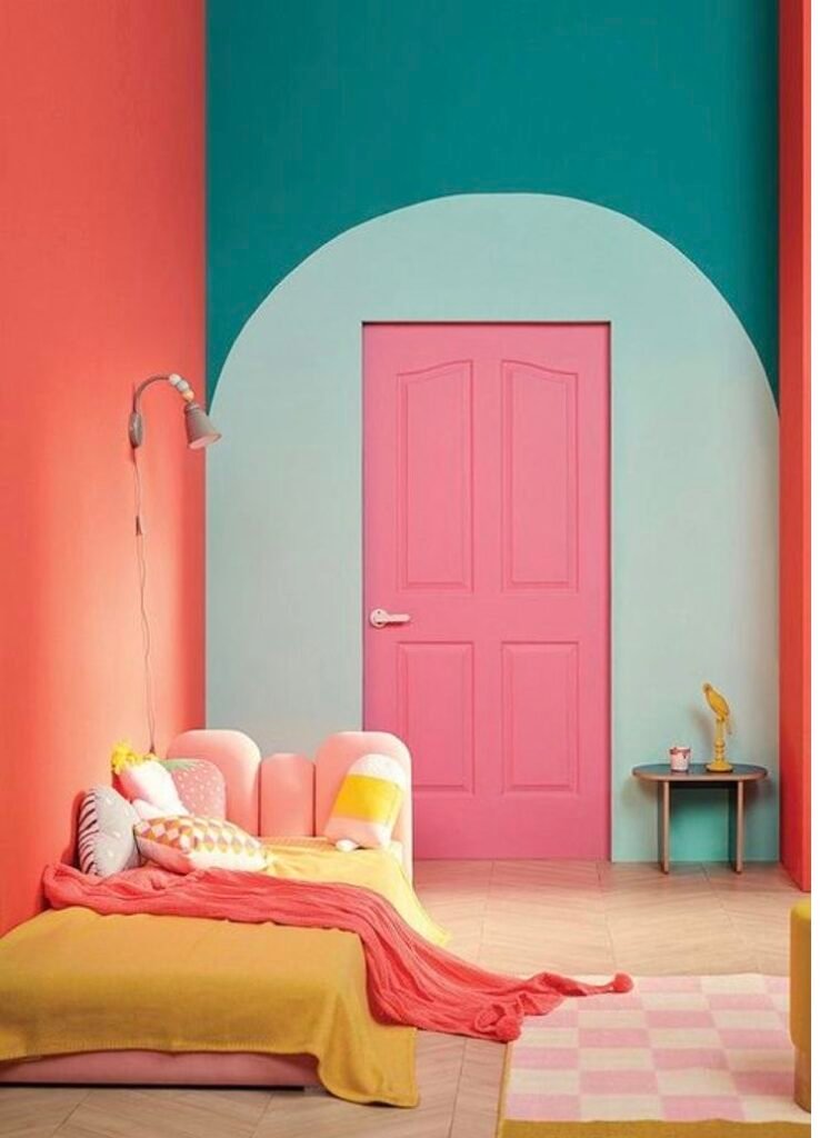 Candy coloured waves around the door frames makes this room eye-catching.