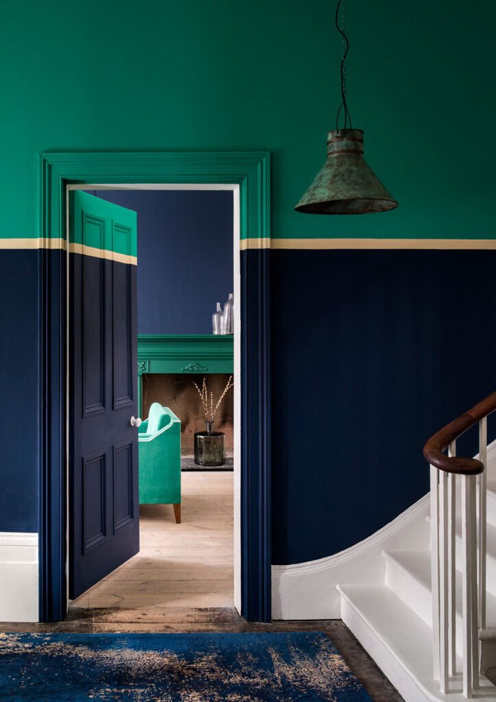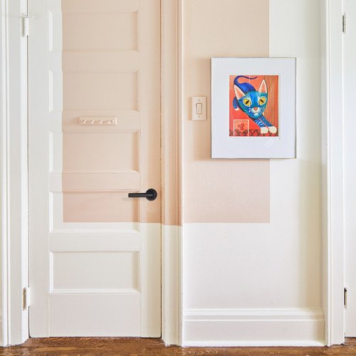 You can choose to paint every door a different colour. The pink and green, picked up from the artwork, make this passageway perfectly pretty.