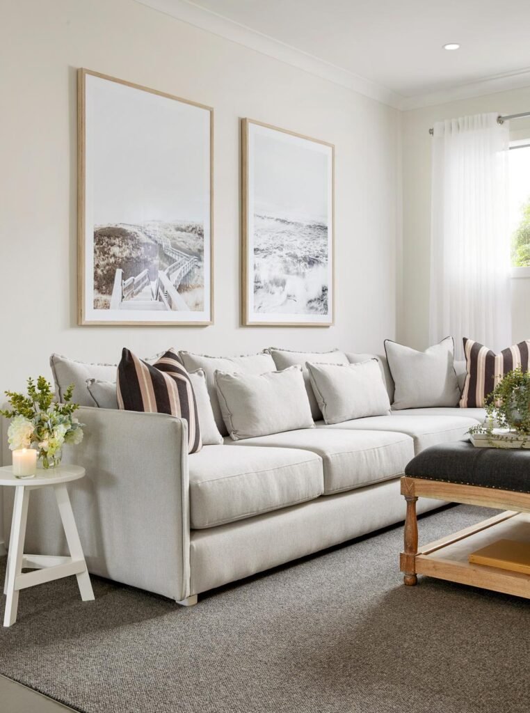 The wall behind the sofa offers a natural frame for artwork. A single large canvas can act as the centerpiece of the living room. A row of smaller prints can form a gallery wall that stretches across the couch length.