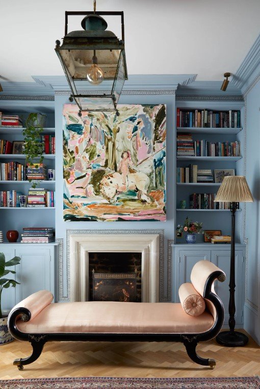 Bookshelves can feel heavy with only books. Hanging art above them lightens the look. It draws the eye upward and balances the vertical weight of the shelves.