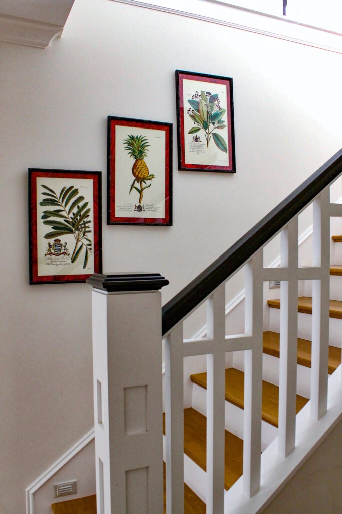 The wall along a staircase offers a tall and dynamic space for art. A series of frames that follow the slope of the stairs looks striking. It creates movement and rhythm as people go up and down.