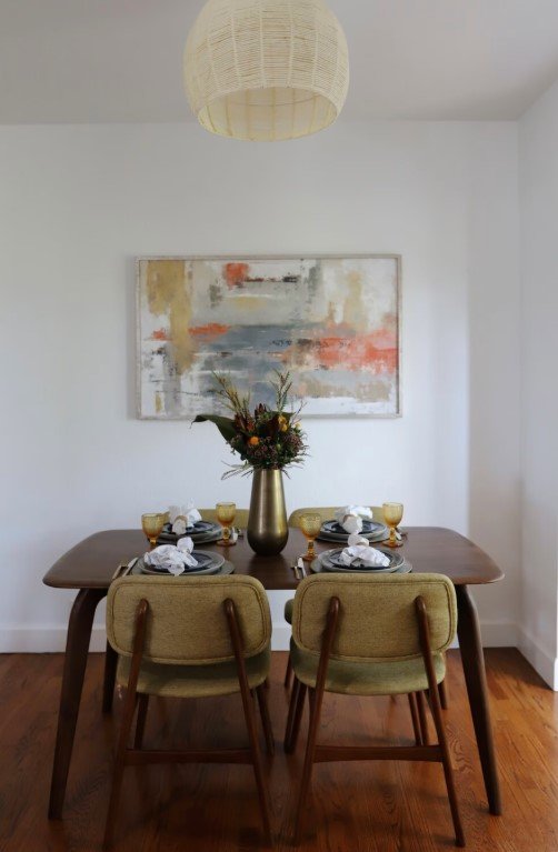 Art in the dining room helps set the mood for gatherings. A large canvas above a dining table looks elegant. A triptych (three connected pieces) works beautifully here too. The dining area often needs one strong focal point rather than many small frames.