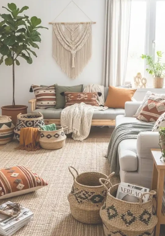 Use woven baskets to bring both style and purpose to your warm boho living room. Their natural fibers and earthy tones create soft texture while keeping clutter hidden. Mix sizes—large baskets for throws, smaller ones for books or plants. Whether rattan, seagrass, or wicker, these pieces add charm and warmth while keeping your space effortlessly organized.
