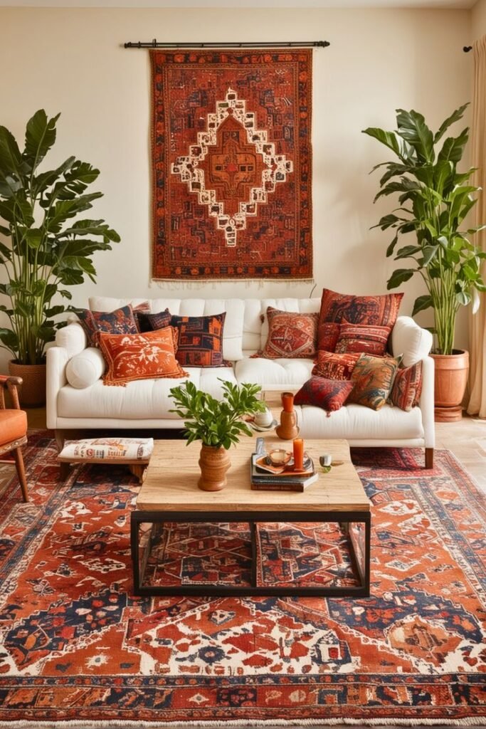 Layer rugs to bring warmth, depth, and texture into your warm boho living room. Start with a neutral jute or sisal rug as your foundation, then add smaller pieces with earthy shades like ochre, rust, or muted red. Mix patterns and textures for visual interest, or use vintage and handwoven rugs for a more collected look. These layers ground the space and create that cozy, relaxed boho atmosphere everyone adores.