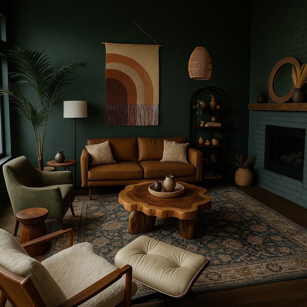 Add earthy tones through furniture that feels grounded and full of texture. A tan leather sofa or a weathered wooden coffee table instantly sets a cozy tone. Blend in woven chairs, rattan accents, or sage-green upholstery for a touch of calm. Deep emerald or terracotta cushions can create contrast and warmth. Mix natural materials and soft fabrics to craft a space that feels warm, collected, and comfortably boho.