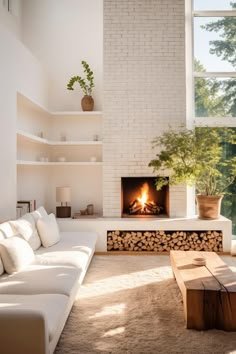 Step into a serene escape where clean lines and subtle textures create quiet balance. A white brick fireplace anchors the space, paired with neatly stacked firewood and a broad window that fills the room with soft daylight. The palette stays gentle—warm whites, pale wood, and linen tones—offering a peaceful rhythm that clears the mind and soothes the senses.