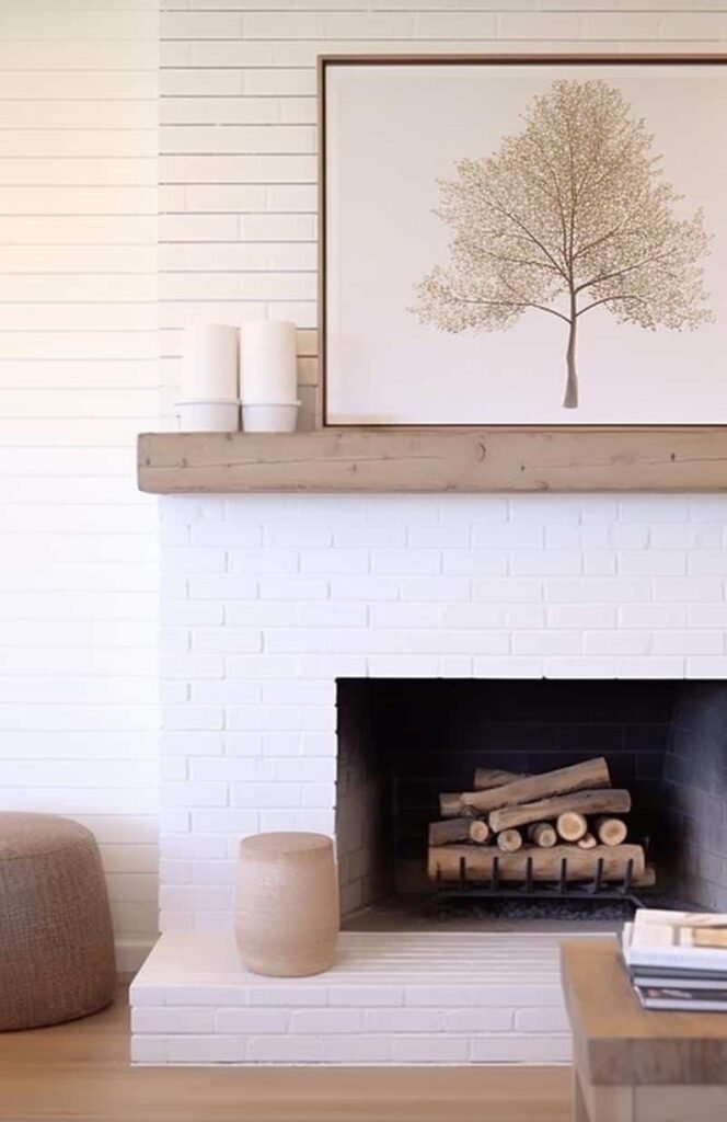 A white brick fireplace framed by clean shiplap walls becomes a canvas for calm. Above it, a weathered wooden mantel carries a soft-toned painting of a solitary tree, lending quiet grace to the space. Pair with muted textures—linen, clay, and oak—to build an atmosphere that feels grounded and reflective. The balance of nature and simplicity turns this corner into a peaceful retreat.