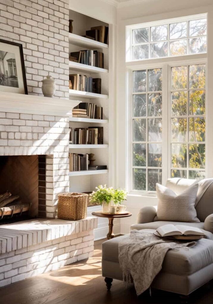 Picture a soft-lit corner where a white brick fireplace meets shelves brimming with well-loved books. A cushioned seat rests nearby, waiting for quiet moments and steaming mugs. The gentle play of texture—linen, brick, and wood—creates an inviting rhythm that encourages stillness and thought. A perfect hideaway for book lovers craving warmth and simplicity.
