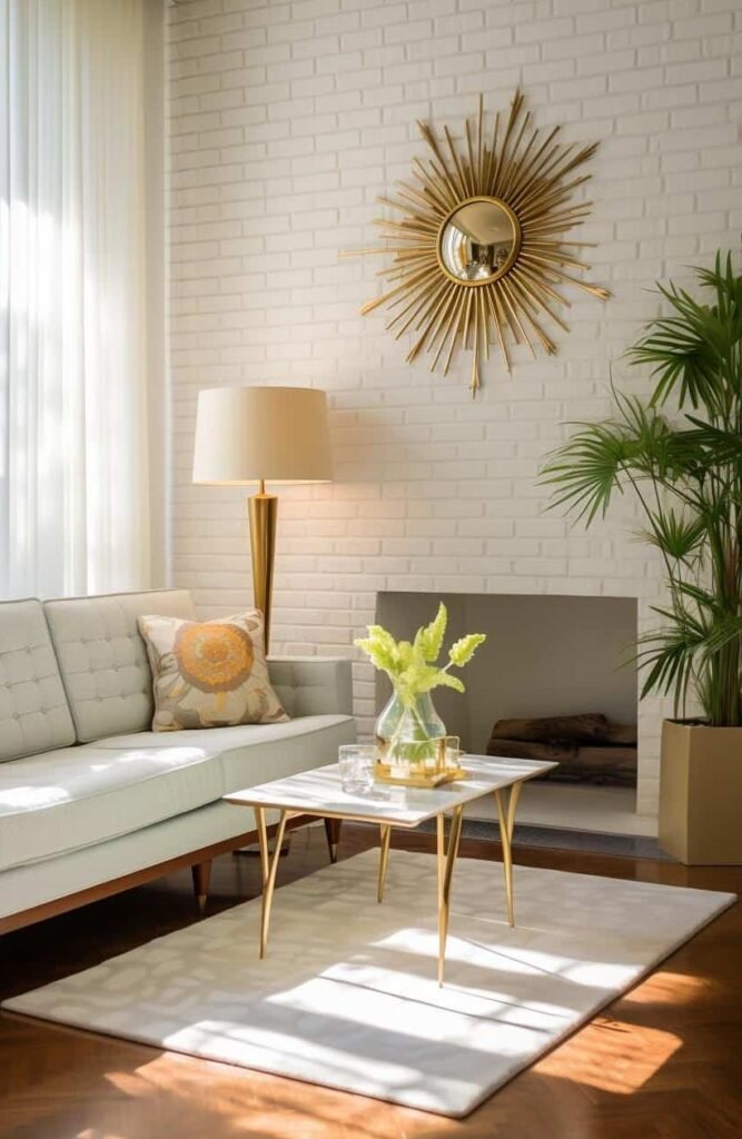 Embrace a retro mood where sleek lines and warm nostalgia meet. A minimalist white brick fireplace grounds the space, crowned with a golden sunburst mirror that radiates charm. Pair it with tapered wood furniture, brass accents, and muted oranges or olive tones to revive mid-century spirit with subtle sophistication. A timeless nod to style and comfort, reimagined for modern living.